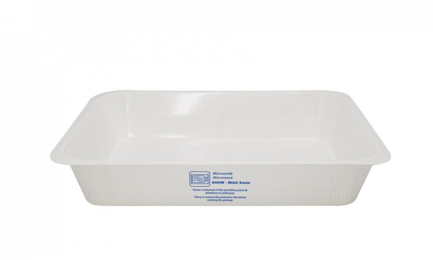 "Tray CA + PET" is a product made of paper with PET, suitable for 1 portion, with measure of 140x125h45 mm - 470 ml. The thermoformed trays are suitable for the packaging of fresh, refrigerated, frozen food products and for ready meals. They can be frozen and heated in a microwave or traditional oven. They present greater flexibility of use and innovative packaging opportunities. It complies with all the standards required for food contact.