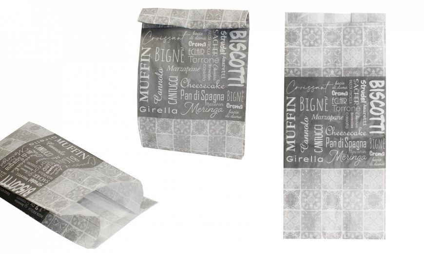 "Sacchetto carta" 12+8x26 è una linea di sacchetti in carta politenata utili per il trasporto di cibi grassi ed oleosi. Tale prodotto è disponibile in vari colori e fantasie, permette di essere riutilizzato più volte dal consumatore. Rispetta tutti gli standard previsti in materia di food contact.