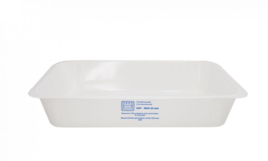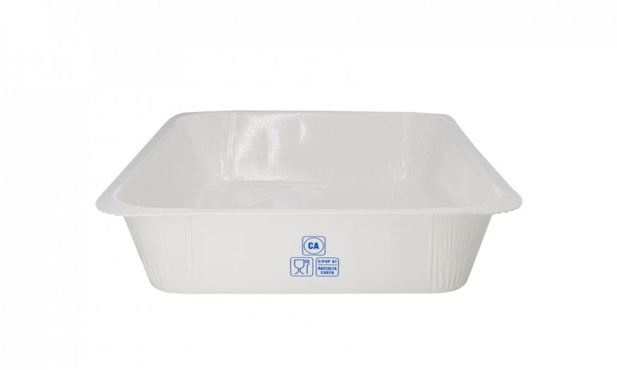 "Vaschetta CA+PET" è un prodotto realizzato in carta con PET, ideale per 4/6 porzioni, misurano 262x192h45 mm - 1680 ml . Le vaschette termoformate sono idonee al confezionamento di prodotti alimentari freschi, refrigerati, congelati e per pasti pronti. Possono essere congelate e riscaldate in forno a microonde o tradizionale. Presentano maggiore flessibilità di utilizzo e opportunità di packaging innovativi.