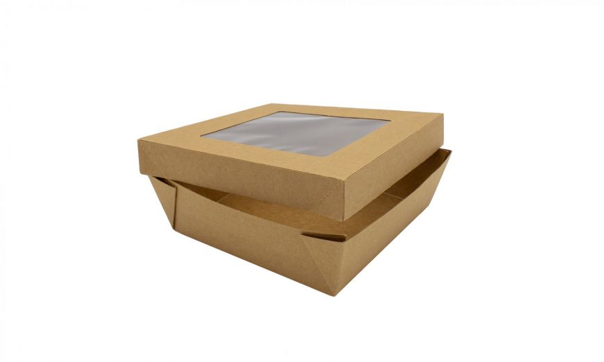 "Linea contenitori finestrati" è la linea di contenitori realizzati in carta kraft avana  accoppiata con PE idonei per l’asporto di alimenti. Grazie all’alta qualità delle nostre materie prime tale prodotto è impermeabile sia da acqua che da oli di qualsiasi genere. Il prodotto ha la particolarità di avere una finestra in PE nel coperchio che permette di vedere il suo interno. Misura 143x143h50 mm e rispetta tutti gli standards previsti in materia di food contact.
